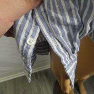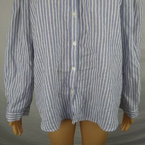 Machine washable cotton/rayon/linen blend. Lightweight, long sleeve, button front, buttons at sleeve cuffs, elasticized around the top hem. Size large.