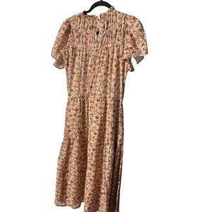 Embrace a blend of elegance and casual charm with this Trovata sundress, showcasing a vibrant orange and pink palette. The dress features flutter sleeves and a mock neck, perfect for wedding guests or casual occasions. Its mandarin collar and midi length add a sophisticated touch to this stylish piece.