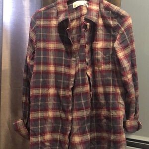 Cozy Plaid Flannel Button-Up Shirt in Burgundy, Grey, and Cream. This comfortable flannel shirt features a classic plaid pattern with a warm and muted color palette of burgundy, various shades of grey, and cream. It has a traditional button-up front, a collar, and long sleeves, making it perfect for layering or wearing on its own. Ideal for a relaxed, cozy, and stylish look during cooler weather.