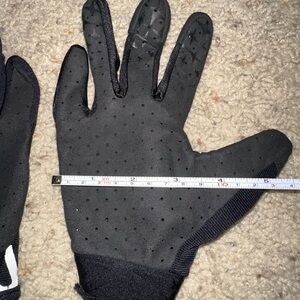 Stylish black gloves with bold white logo design. Perfect for a sleek look. Size 8 I think. 7.5 inch wrist to end of middle finger. 3.5 inch across palm