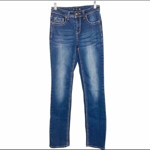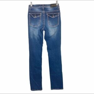 Thick Denim Tru Luxe skinny straight jean. Bold stitching in white and yellow. Excellent pre worn condition. Medium wash.