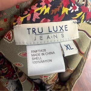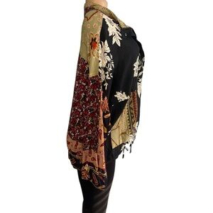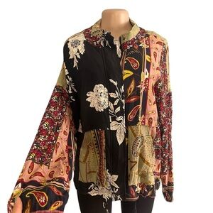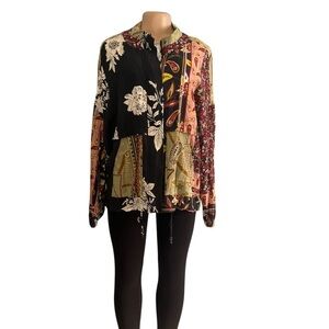 Tru Luxe Floral Patchwork Zipper Snap Front Drawstring Bohemian Jacket Size Xtra Large This stylish women's jacket features a vibrant patchwork design with a mix of colors including black, pink, and green. Perfect for adding a unique touch to your wardrobe.
