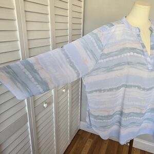 TruSelf Blue Green Watercolor Striped Tunic Top Size 3X Split Neck Coastal Boho