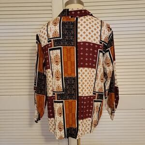 boho patchwork shirt, True Self button down, women’s medium blouse, brown red top, rolled sleeve blouse, cotton blend shirt, relaxed fit casual shirt, vintage-inspired boho, indie style women’s, artsy patterned shirt, fall fashion layering, front pocket blouse, cottagecore top, lightweight long sleeve, earthy tones shirt, southwestern style, statement print blouse, hipster fashion top, festival ready shirt, unique patchwork style, effortless chic top, eclectic women’s clothing, all season tunic