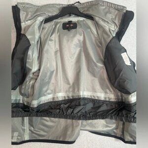Hood can be adjusted with a draw cord, rolled up and stored in collar