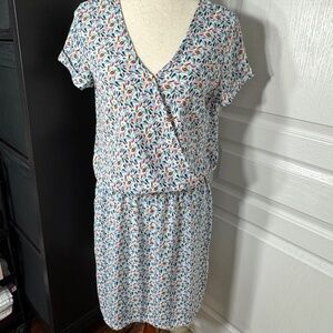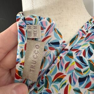 Lightweight Trucco dress from Spain with a beautiful multicolor rainbow fleck pattern. Short Sleeve with Elastic Waist and Pockets. Dress it up with a Belt. Great for weekends or work. Mock Wrap Dress sewn shut at neck. Belt not included