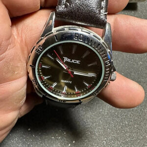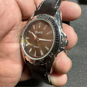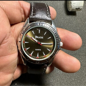 Truce Mens Quartz Watch Silver Tone Brown Strap Working With New Battery shows signs of wear such as light scratches on case and crystal see pictures for reference
