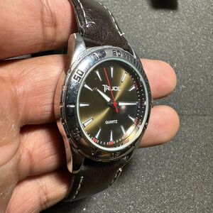 Truce Mens Quartz Watch Silver Tone Brown Strap Working With New Battery