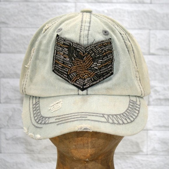 Trucker Hat Baseball Cap Distressed Faded Denim Beaded Metallic Patch Vintage