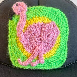 Trucker Hat w/ Crochet Flamingo Granny Square Style Adjustable Handmade Black