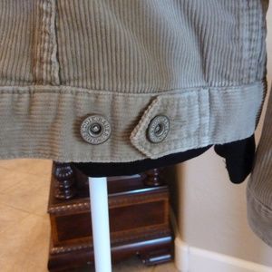 Eddie Bauer Corduroy Trucker jacket. EUC. Four pockets, 2 at waist 2 at chest. Metal buttons, button cuff, adjustable waist. Cotton. Bust 21" across, Waist 20" across, Bottom 22" across, Shoulders 18". Sleeve 24", Back length 23 1/2" .