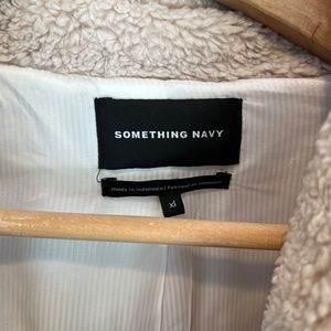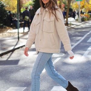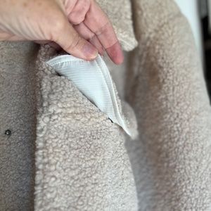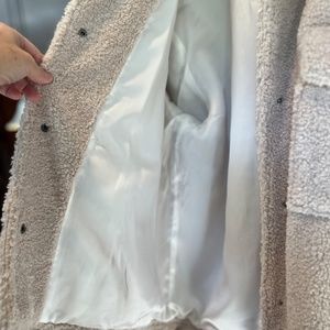 This mid - weight sherpa like Trucker Jacket is soft and easy to wear. Drop shoulder, hits at the hip with four pockets on the front. Snap closure at front and on sleeves. Excellent condition worn only 2 times.