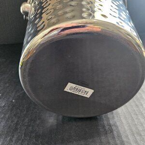 A great, elegant ice bucket from Trudeau. Stainless steel for durability, shine and a great, dimpled, hammered finish. Perfect for your parties to hold ice or to chill your favorite beverage. The sides have movable rings for carrying the ice bucket. Measures 8 1/4 inches tall by 8 3/8 inches wide. Preowned in very nice condition. Only signs of previous use is some wear on the bottom, from table contact. Non smoking, pet free home.