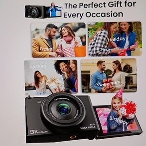 *The first 9 pictures are online photos, the next 6 are the actual item, and as you can see, the online photos match the actual item. About this item Unmatched 5K Cinematic Clarity – 40% More Shadow Detail Than 4K Capture 40% richer shadow detail and 60% less noise in low light compared to standard 4K cameras. The F1.8 large aperture and multi-coated lens deliver true 80MP resolution—sharp enough to reflect individual eyelashes—far beyond the blurry digital zoom of typical 4K models .True 18X Zoom – Optical Precision, Not Just Digital Tricks Achieve 300% sharper long-distance shots with a true 6X optical zoom combined with digital zoom. Unlike standard cameras limited to 16X digital zoom, this lens maintains full image clarity when zooming in .Pro Vlogging Setup – 270° Flip OLED Screen + Dual Lenses Equipped with a 3" OLED screen that flips 270° with anti-glare coating, perfect for outdoor shooting. Combined with front and rear dual lenses, this camera is a powerful tool for vloggers, creators, and selfie lovers .Shoot All Day – 18 Hours Runtime + Fast Charging Charge up to 80% in just 30 minutes with Type-C PD fast