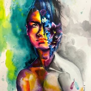 Colorful and vibrant, this painting features a Two-Spirit, Lakota person whose modern mohawk transitions into flowers as they gaze serenely at the viewer.