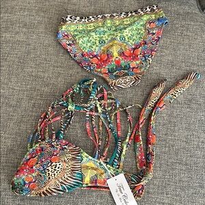 Vibrant bikini set with multicolor patterns. Features a unique design with animal and floral prints.