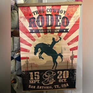 Bold poster featuring a cowboy on horseback. Red and cream design with western motifs.