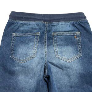 These adorable jeans feature a pull-on jogger style in a medium wash denim material. They have a navy blue ribbed waistband with a drawstring and ribbed cuffs at the ankle. There are pockets on the front and back. VGUC Size 8