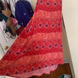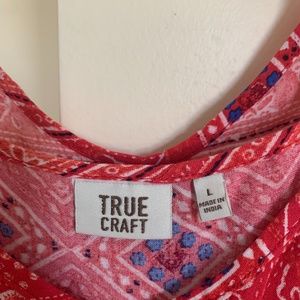 True Craft red/blue aztec printed dress. Originally purchased from Belk. Super loose and comfy dress, a lot of material flows off in the back and the sides! 3rd pic shows how much the dress flows and last two pics are to see how it fits; I am 5"9' and this is how far the dress comes on me! #truecraft #dress #reddress #bluedress #aztecdress #flowydress#casualdress #belk
