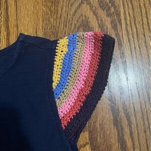 This is a super cute navy tank by True Craft. It has crocheted capped sleeves and is 100% cotton. It is perfect for spring and summer. The shirt is a size small.