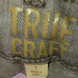 This is a pair of gently used True Craft Distressed Skinny Jeans Size 1 in an olive color. They have raw hems as well as other distressed accents.