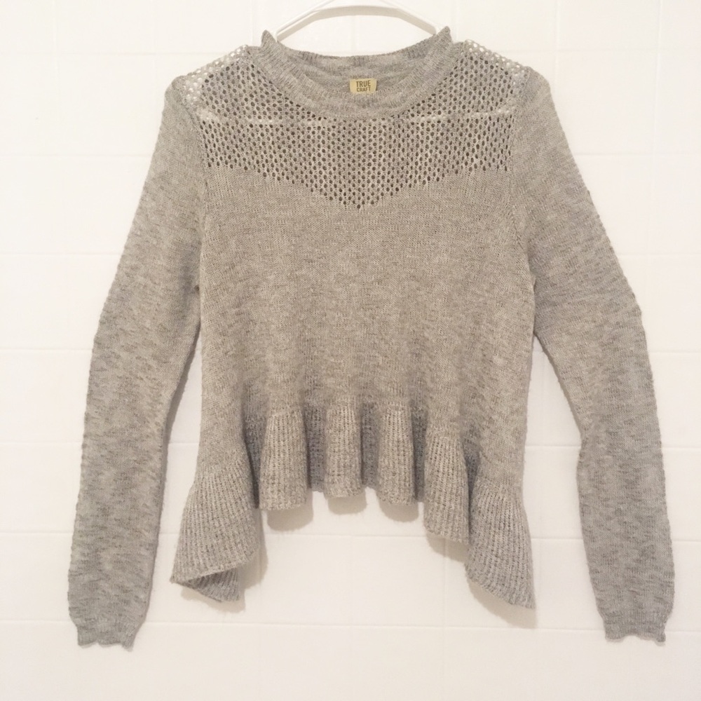 True Craft ruffle edge sweater in heather grey. Size large but fits a little small. Great condition