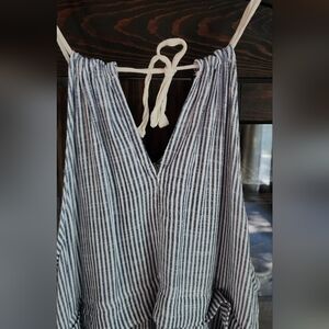 Elegant dress with a striped design. Features a relaxed fit and delicate straps.