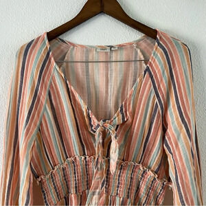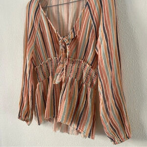 True Craft, peasant top, smocked, tie front, striped, pastel, sheer, gauzy, lightweight, beachy, vacation, resort wear, summer, spring, boho, cottagecore, romantic, feminine, flowy, relaxed fit, stylish, trendy, versatile, indie, street style, vintage inspired, western, chic, casual, everyday