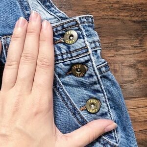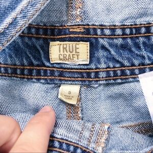 Fabulous denim overall shorts by True Craft. Classic shortalls style in medium wash cotton denim with cutoff frayed cuffs. Super soft broken in 100% cotton denim. Waist 32-33“, hips approx 43“, rise 10.5”, inseam 2.5“. Marked size 9, fits like womens M (please check measurements), excellent preowned condition.