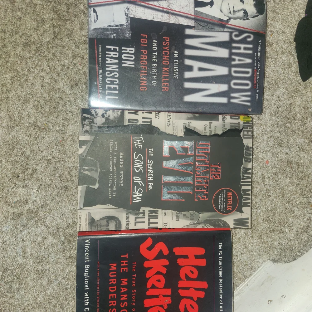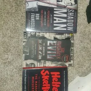 Set of three gripping true crime books. Includes 'Shadow Man,' 'The Ultimate Evil,' and 'Helter Skelter.' Perfect for crime enthusiasts.
