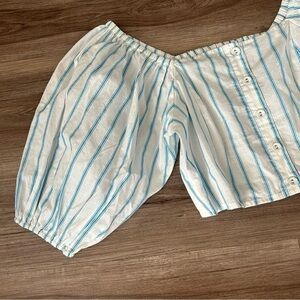 True Destiny White Blue Stripe Front Button Crop Puff Sleeve Top Women MediumNWT