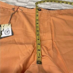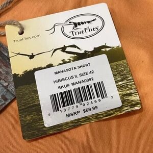This is a pair of True Flies Men's Manasota Shorts in size 42, featuring a vibrant hibiscus orange color.