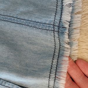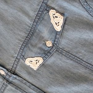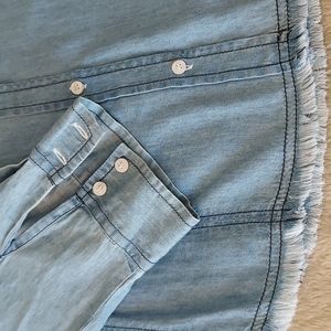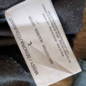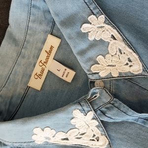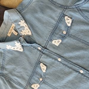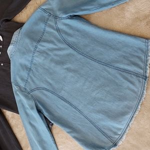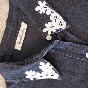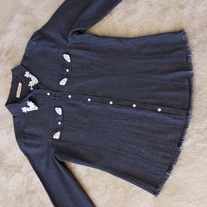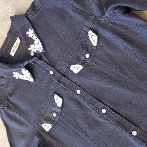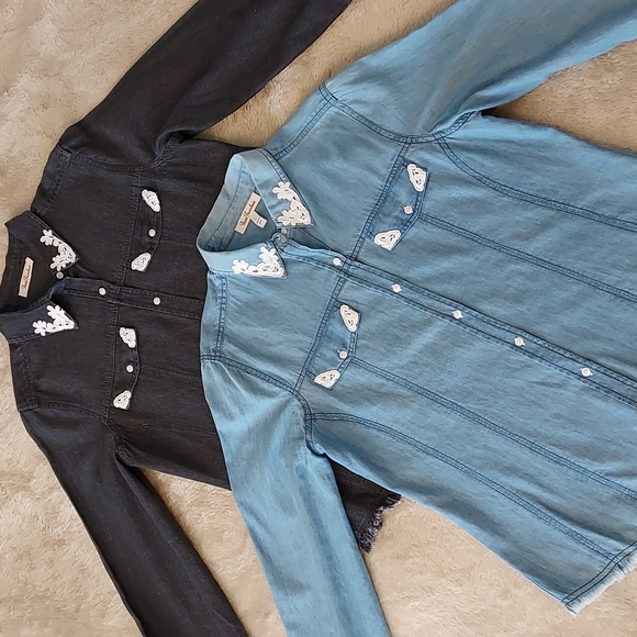Medium weight 100% cotton denim blouses. Button front & cuffs, no pockets, embroidery white decals, soft fringe along bottom, little stretch. 27" long, sleeves 25", armpit to armpit 21" laying flat. Tapered for slimming look. Black & Light Blue denim size Juniors Large. New, without tags. Sell separately if desired.