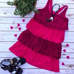 Pink sun dress with layers and tribal motif by True Freedom. Such a fun little dress, I especially like the back. This one is M Junior size. Measures 15 inches across from armpit to armpit and 30 inches in length. 83% polyester and 17% rayon.