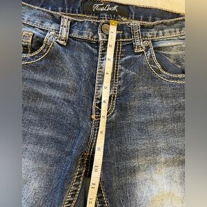 Gently worn True Luck jeans in a classic blue wash with intentional fading and light distress details. Features a bootcut leg, contrast stitching, and a comfortable mid-rise fit. Great everyday denim for a laid-back look!