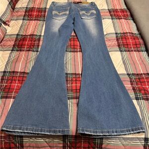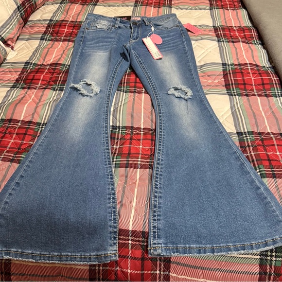 Stylish and comfortable blue flared jeans perfect for any casual outing. Features a trendy distressed design. Elevate your wardrobe with these must-have jeans.