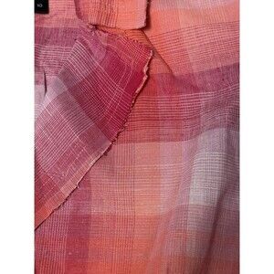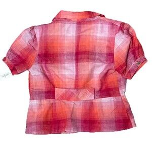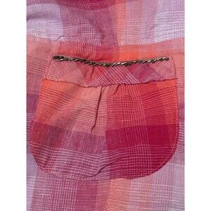 New with tags True Meaning Y2K cropped blazer-style top in a pink, lavender, and orange plaid linen-cotton blend. Puff short sleeves with rhinestone cluster snap accents. Features a raw edge collar and placket with a tailored hemline and cuffs, decorative beaded pocket trim, and a back waist-belt accent. Designed to layer over tanks iconic early 2000s style. Perfect for retro lovers, Y2K stylists, or glam layering.