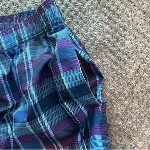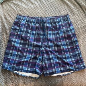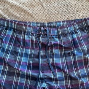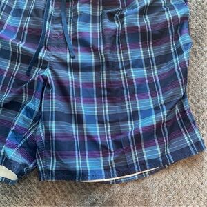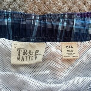 True Nation 3XL Swim Shorts Blue and Purple. In great condition with no signs of flaws. Has a drawstring, internal mesh, and two side pockets. Has a checkered pattern with purple and blue colors. Perfect swim trunks in time for summer vacations, beach, pool, cruise, etc.