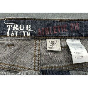 Men's True Nation Athletic Fit blue jeans, mid-rise, size 44x28. Distressed, medium wash jeans with a slight give at waist. No rips, stains, holes or tears. Pre-owned. Measurements in photos. Smoke free home.
