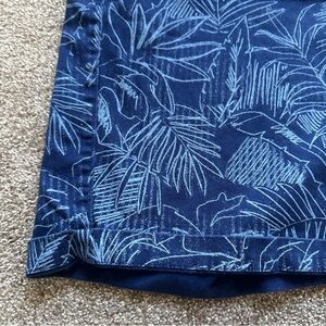 Athletic-fit navy blue shorts with an all over tropical palm print. Features an elastic drawstring waist for a custom fit. Has side pockets & back welt pockets. Comfortable and versatile, crafted of smooth cotton with a touch of stretch.