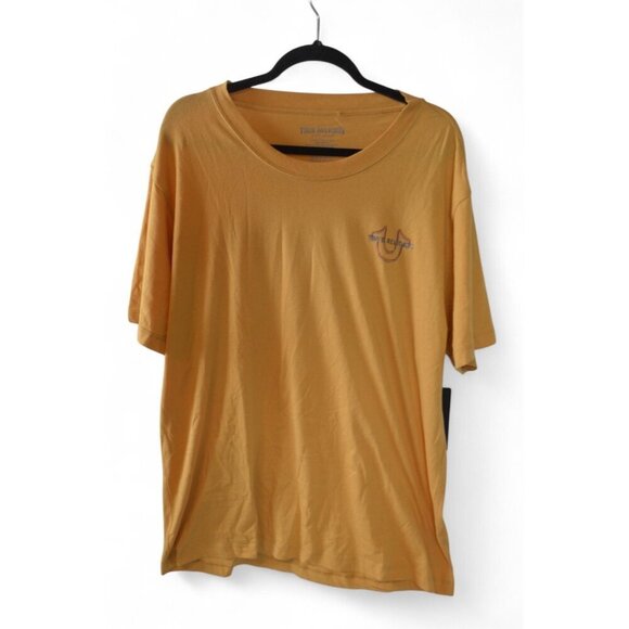 📝 Description: Add a bold pop of style to your wardrobe with this True Religion men’s tee in Oak Buff, a rich golden mustard shade. Features the iconic horseshoe logo printed on both the chest and across the back in detailed multicolor stitching.