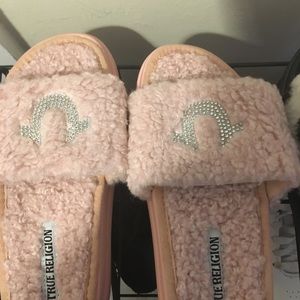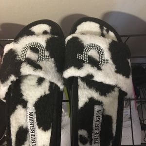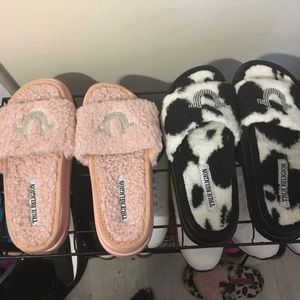 Two pairs of true religion slides the pink pair is a size 6 and the cow like colored ones are a size 7 50 dollars for one pair or a 100 for both