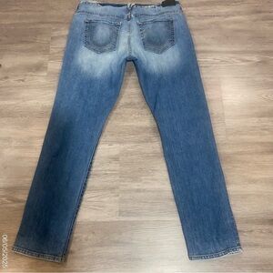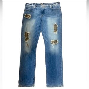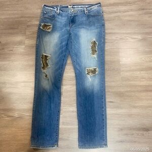 Authentic True Religion “Audrey” Slim Boyfriend Jeans, size 29. These standout jeans feature a medium wash with heavy distressed detailing and unique snake print patch inlays. Mid-rise with a relaxed slim fit for casual comfort and edgy style. Made in the USA with premium denim construction. Perfect for adding a bold twist to your everyday look.