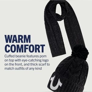 True Religion hat and scarf set that's perfect for the outdoors during the colder climate.
