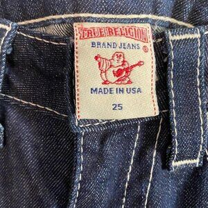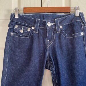 True Religion Women's Becky Embellished Rhinestone Flap Button Pocket Stadium Patch Jeans Size 25. Excellent preowned condition. Measurements Waist: 28" Inseam: 31" Rise: 7" Offers always welcome! Measurements are approximations taken while hanging