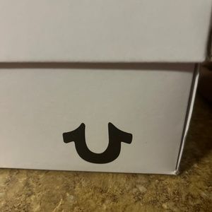ONE SIZE FITS ALL Women’s bedazzled gold True Religion slides with black rhinestone accents