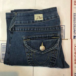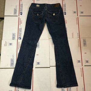 True Religion Big T Jean Size 28 Flap Pocket Twisted Flare Leg Distressed