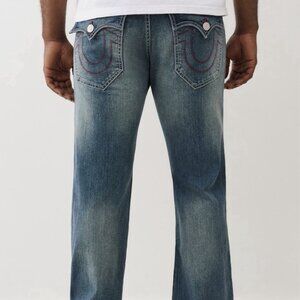 The product is a pair of True Religion Billy Bootcut Jeans in a light autumn color, size 36x34. These denim jeans feature a solid pattern, zip closure, and a mid-rise fit. Made of cotton denim, they have a 5-pocket design with logo accents and are machine washable. The bootcut style adds a modern touch to the classic blue color, making them versatile for any season. Perfect for the fashion-forward man looking for a stylish and comfortable pair of jeans.