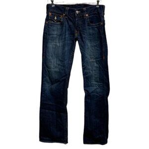 True Religion Billy Men’s 34W Blue Denim Jeans Straight Leg USA Distressed Hem