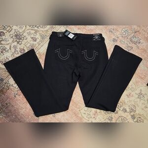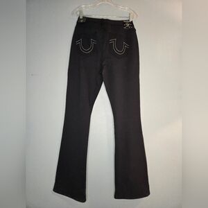 True Religion Black Becca Ponte Mid-Rise Bootcut Jeans with White Stitch Details on Back Pockets in Size 32.